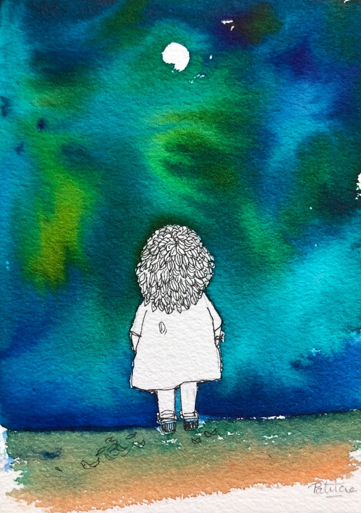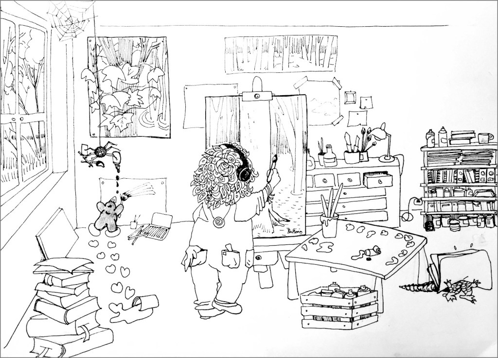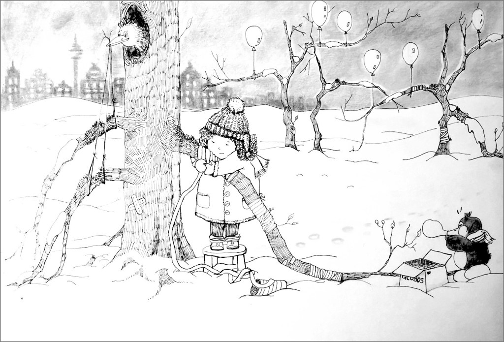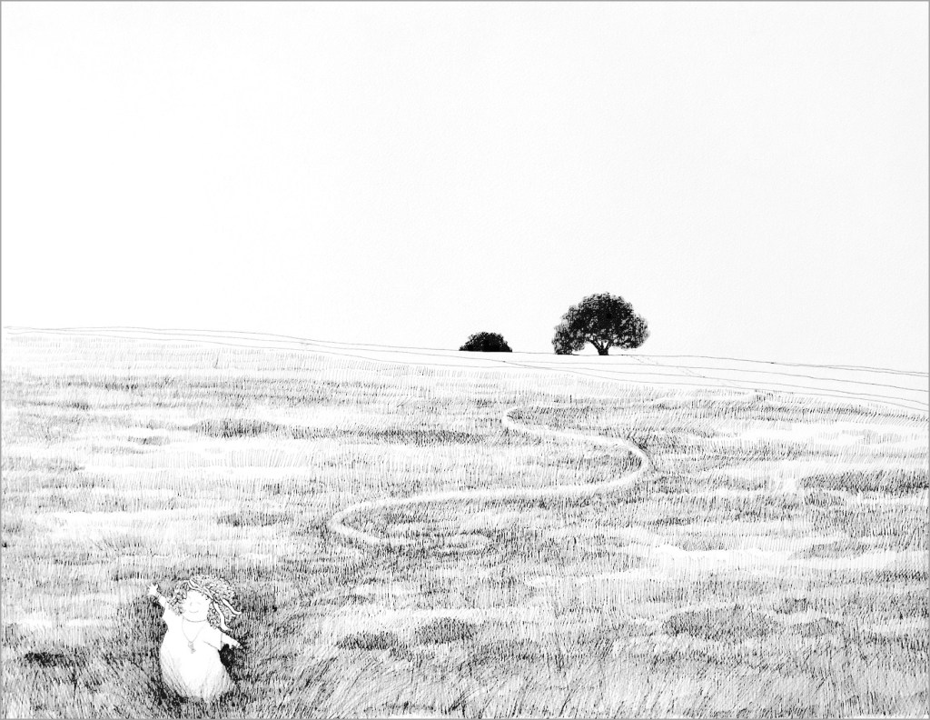 Here I am! Ink on paper, 21x30.Who's there?Ink on paper, 21x30.Who are you?Ink on paper, 21x30.I don't want to!Ink on paper, 21x30.Where am I?Ink on paper, 21x30.Dreaming. Ink on paper, 30x42.Party on the rooftop. Ink on paper, 21x30..Spaghetti and shrimps. Ink on paper, 30x42.On the way.Ink on paper, 21x30.What are you doing?Ink on paper, 21x30.Another world.Ink on paper, 21x30.Looking.Ink on paper, 21x30.She wants to be a painter.Ink on paper, 21x30.At home.Ink on paper, 30x42.Gently. Collage, 15x10.Tribute to the trees of Madrid, with love. Ink and charcoal, 30x42.On her way back. Ink on paper, 50x70.