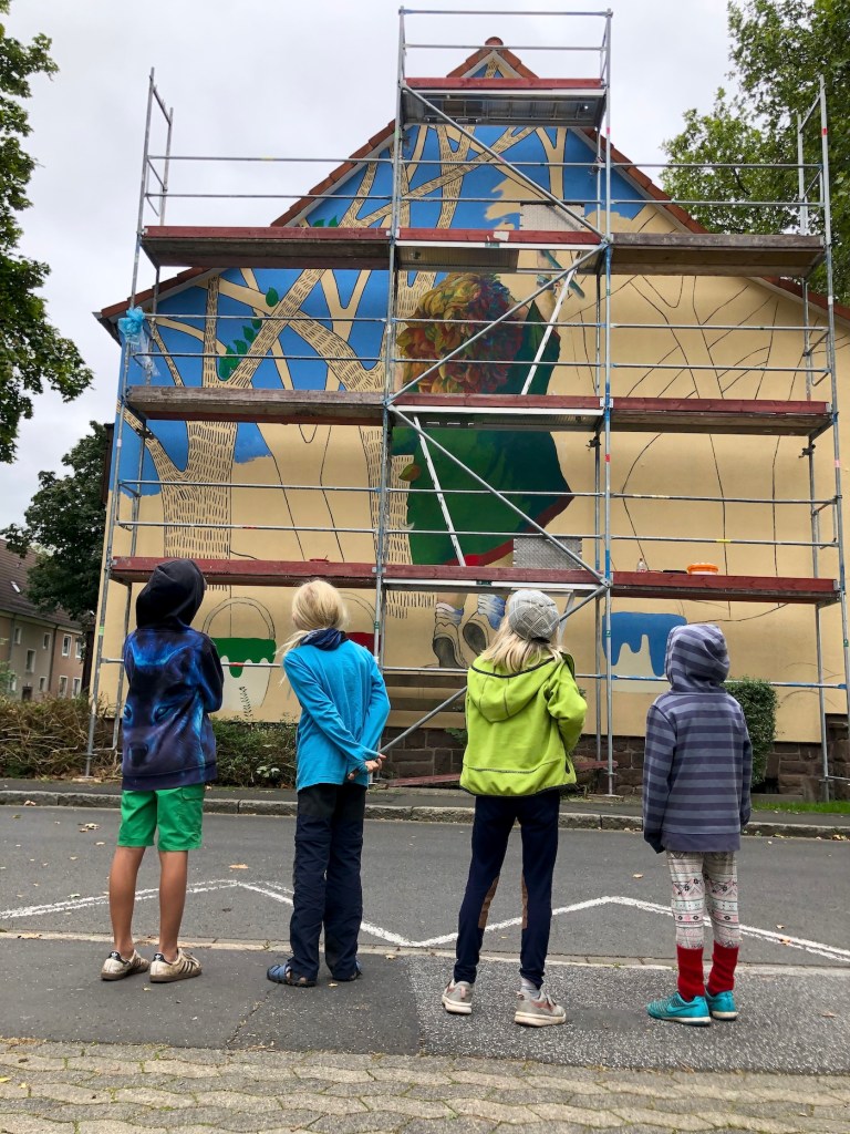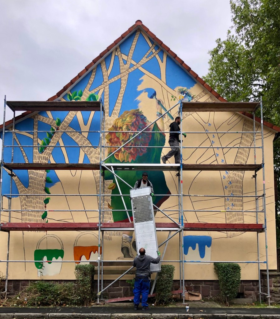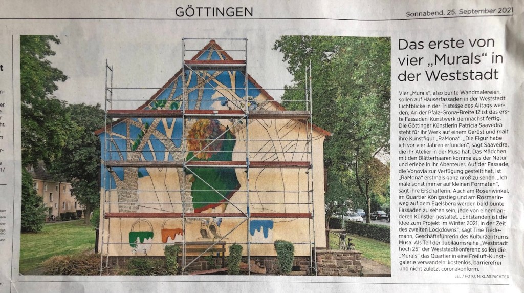 En el invierno de 2021 nació el primer proyecto de arte urbano de la ciudad de Göttingen en el que participé para pintar una de las fachadas del distrito de Weststadt. Al final del verano se instaló el primer andamio en la esquina de Narzissenweg, donde durante seis semanas pinté mi primer mural: 70 metros cuadrados para RaMona